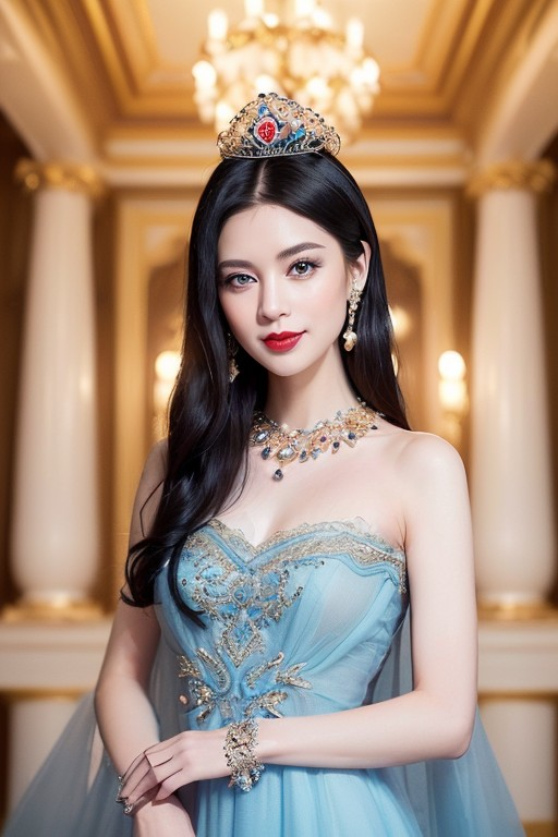 (high-quality, high-definition, (one woman), (middle-aged woman), (princess-like dress:1.5), (luxurious accessories:1.2), (minimal skin exposure:1.5), (semi-long, glossy black hair), (graceful smile:1.1), (bright blue eyes), (vibrant lipstick), (luxurious palace interior with decorations:1.2), (blurred background with F-value 2.8, (minimize skin exposure:1.5), (gaze towards the viewer:1.2))